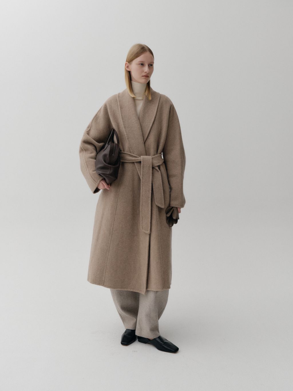 포근하게 감싸 안는 듯한 여유있는 실루엣이 돋보이는 핸드메이드 로브 코트