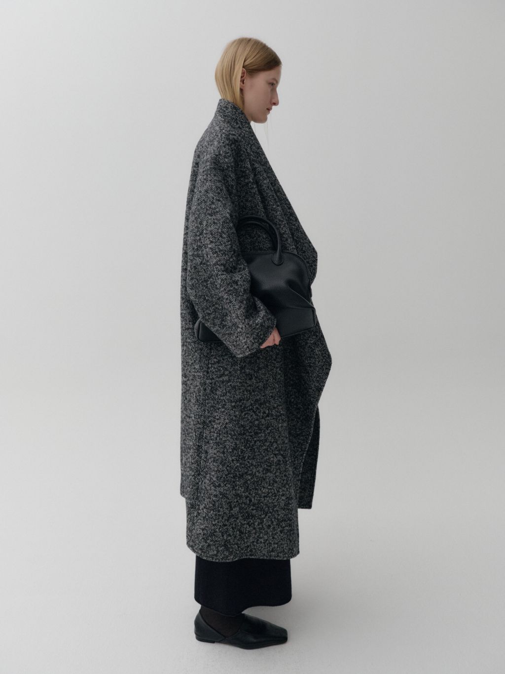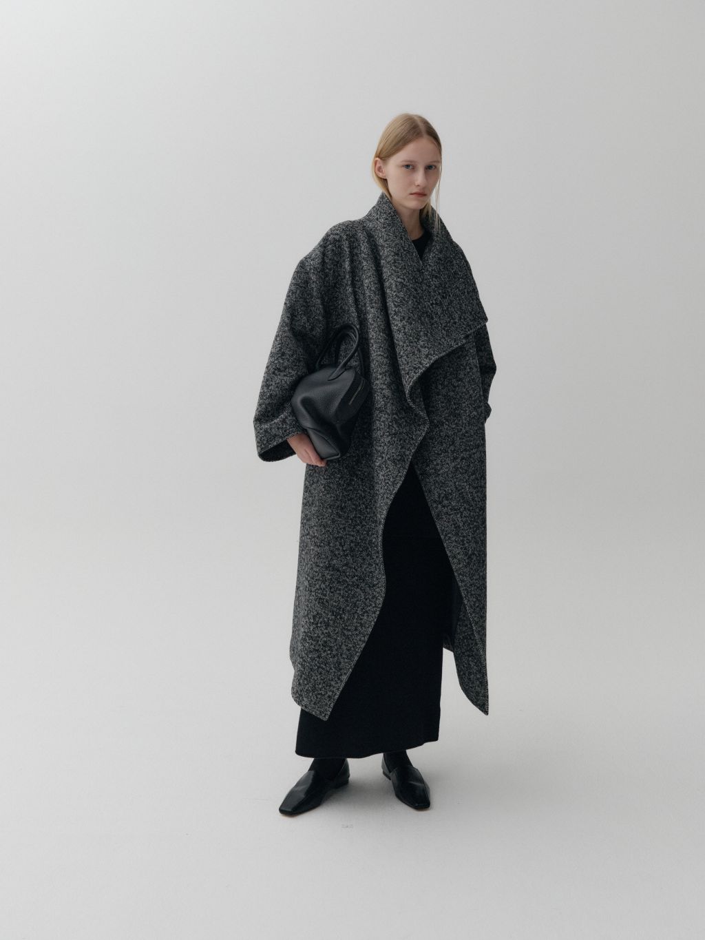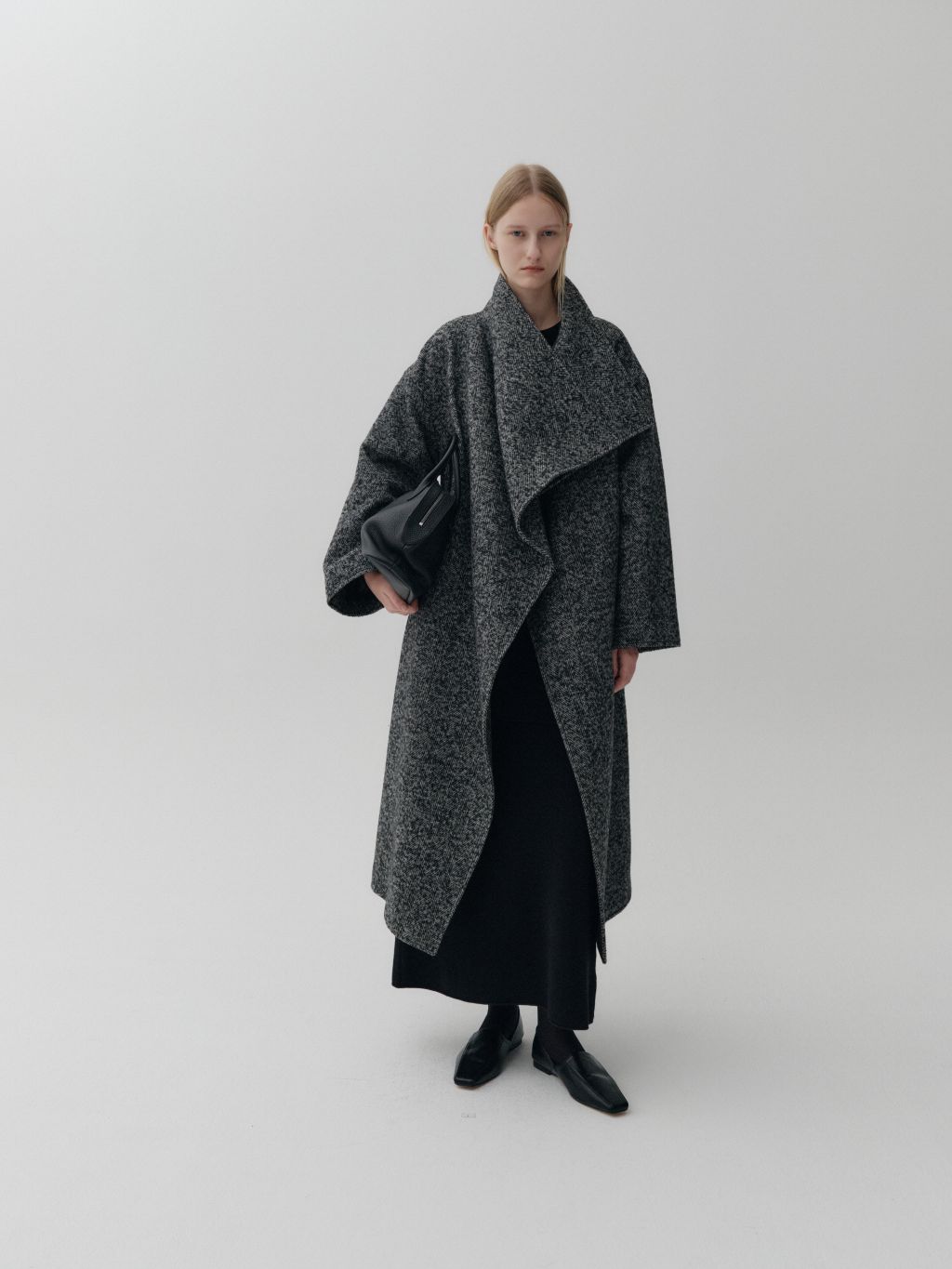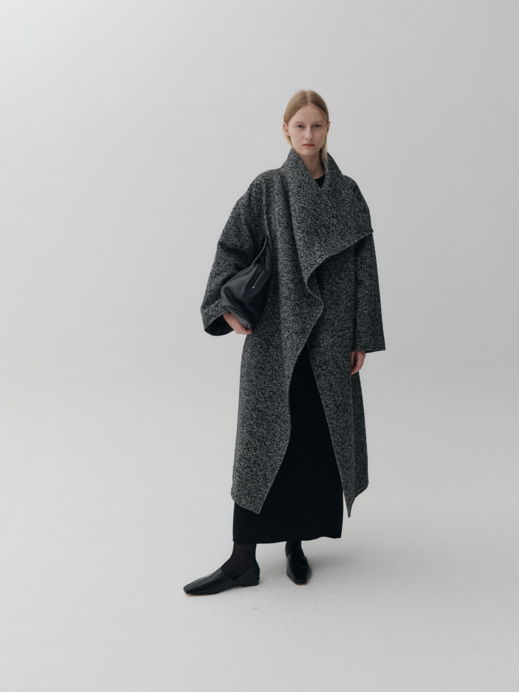 자연스럽게 흐르는 숄 디자인과 롱한 기장감의 오버사이즈 실루엣