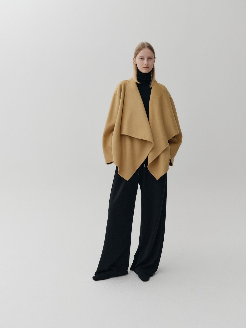 캐시미어 50% 울 50% 혼방소재를 사용한 깊이 있는 텍스처와 자연스럽게 흐르는 오버사이즈 실루엣의 숏 숄코트