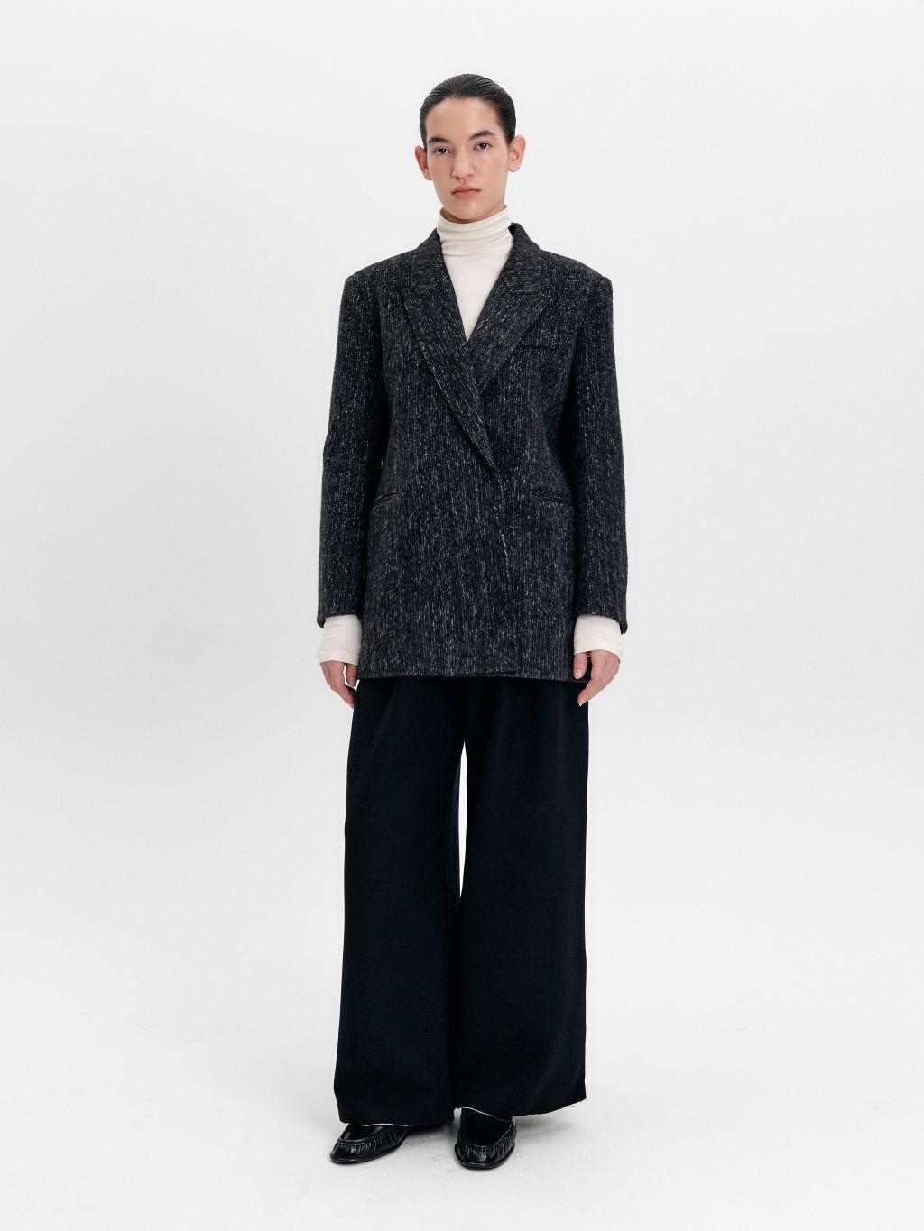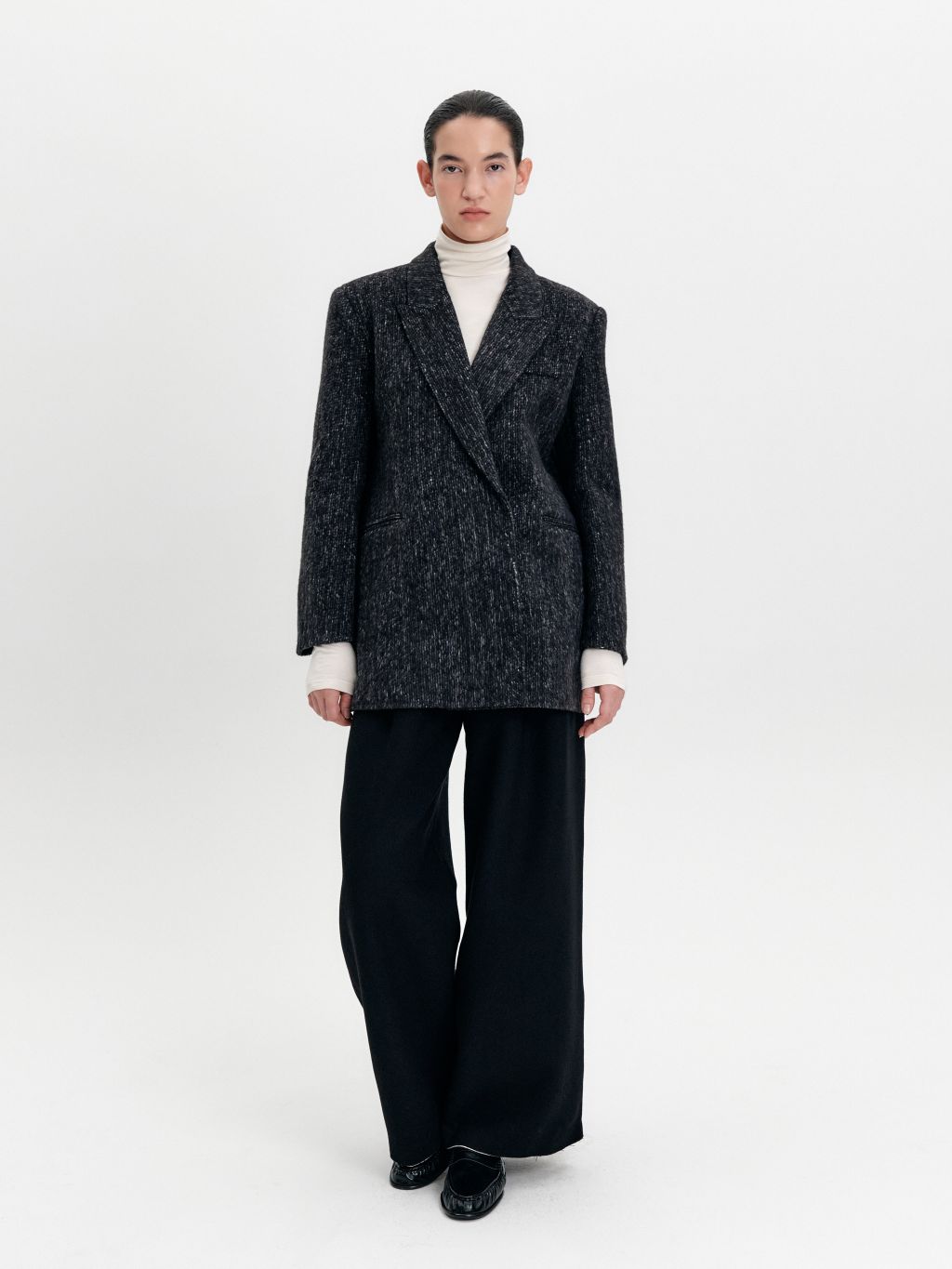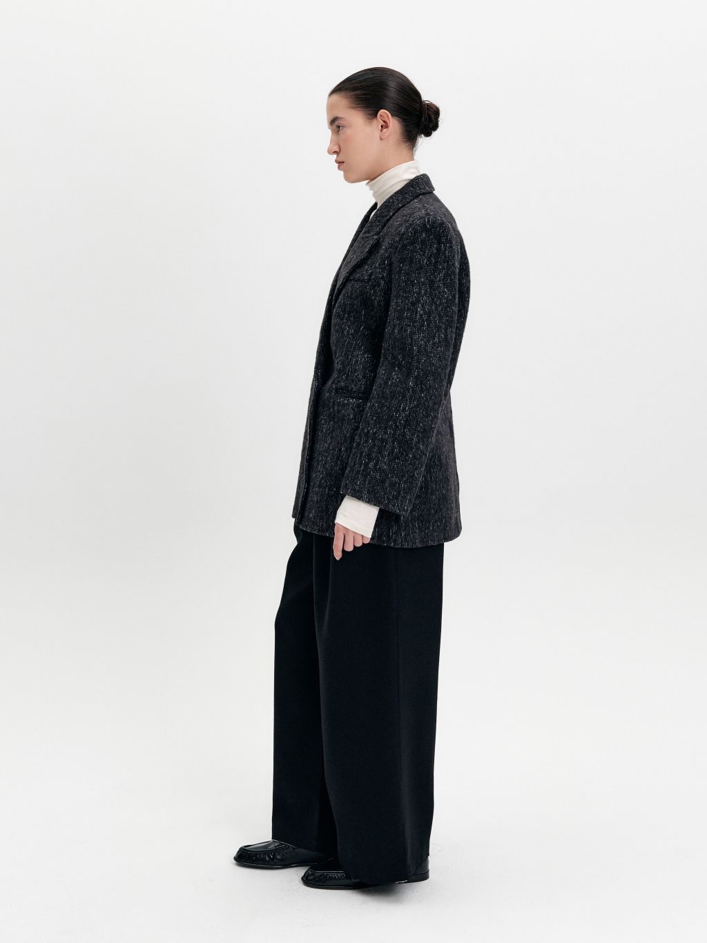 3. 스냅 여밈으로 군더더기 없는 외관을 연출하는 싱글 브레스트 디자인