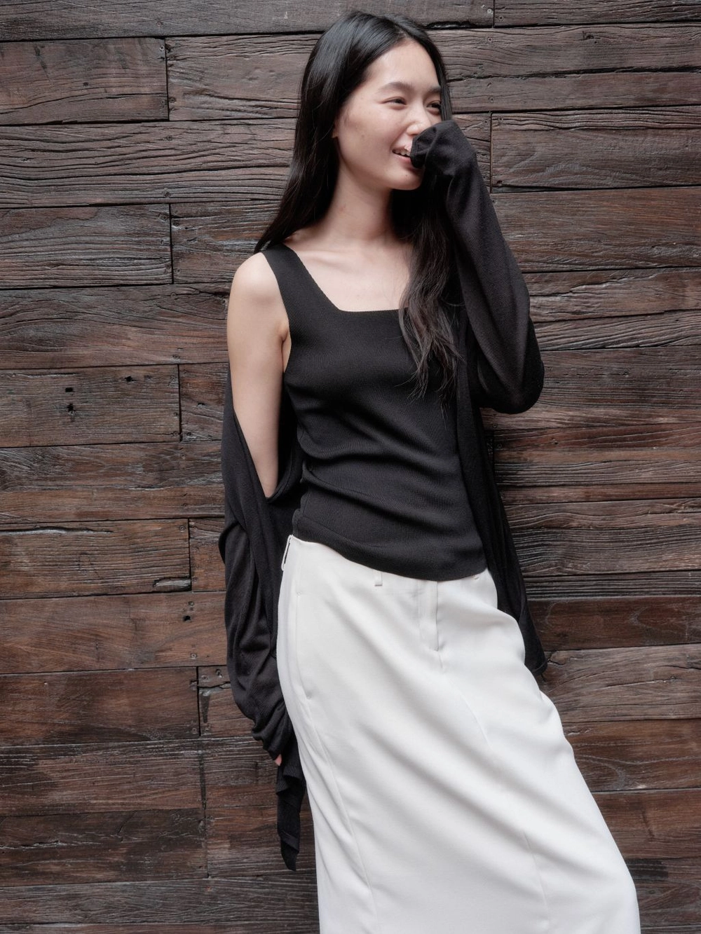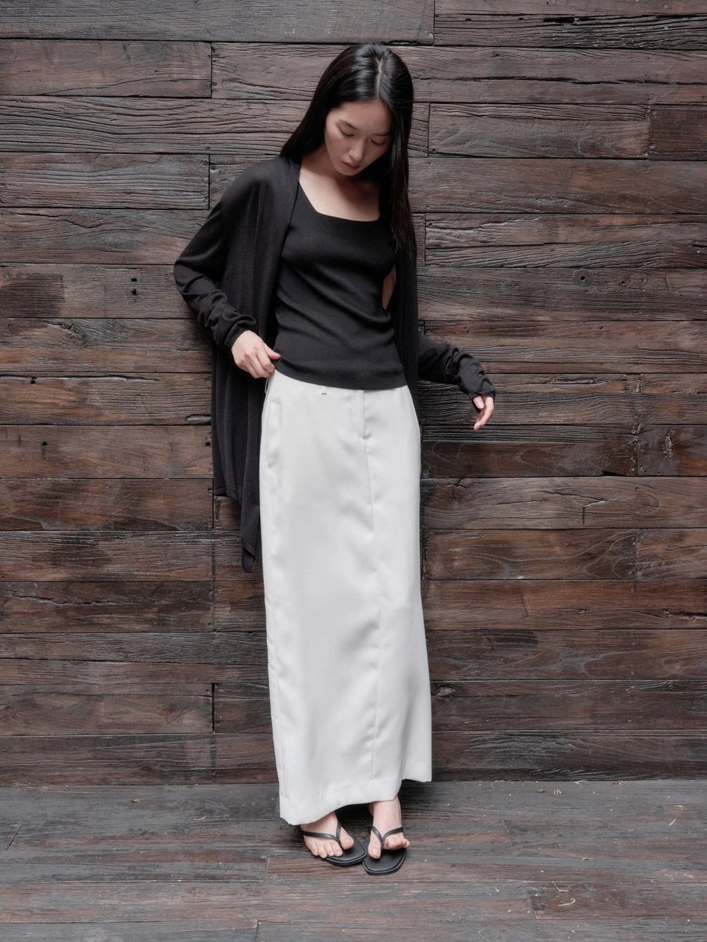 4. 힙을 가볍게 덮는 기장감과 앞중심의 적당한 단차로 이루어지는 드레이프 라인으로 페미닌한 무드를 더해줍니다.