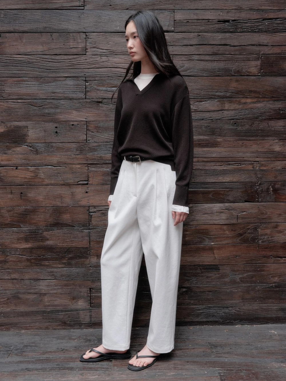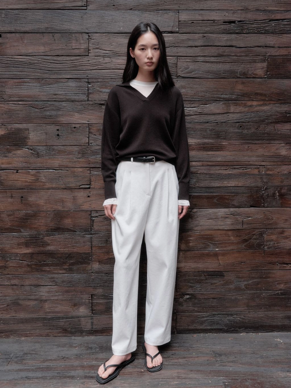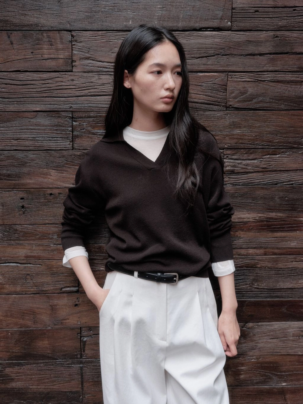 1. 부드러운 터치감과 오픈 카라 네크라인 디자인의 니트 풀오버