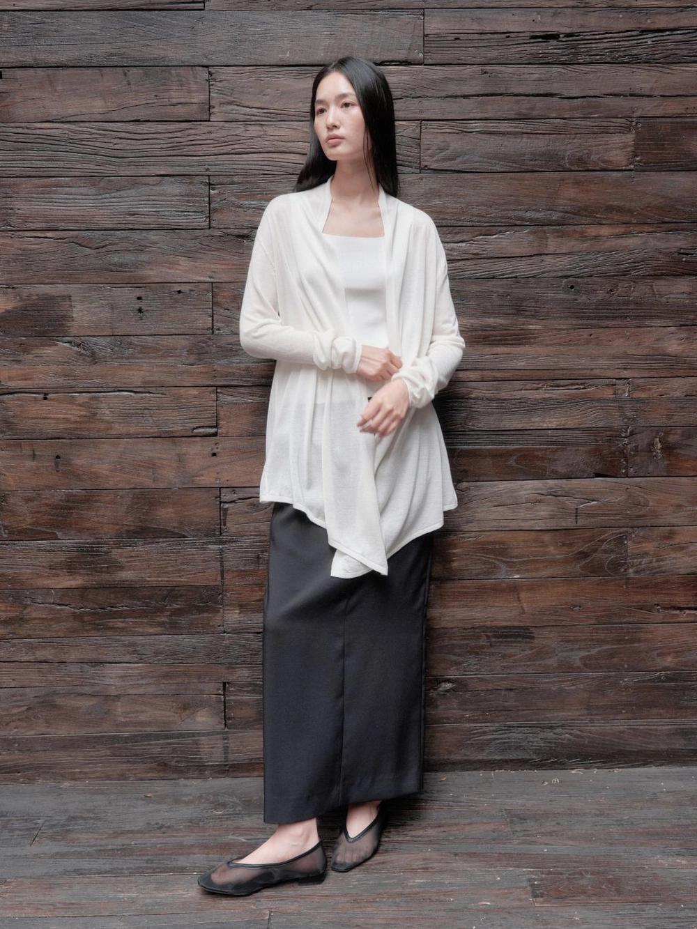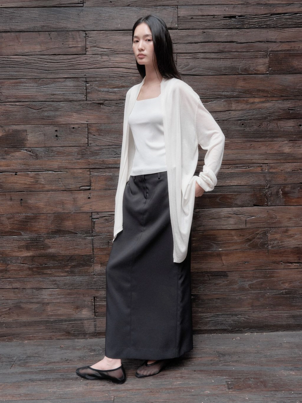 4. 힙을 가볍게 덮는 기장감과 앞중심의 적당한 단차로 이루어지는 드레이프 라인으로 페미닌한 무드를 더해줍니다.